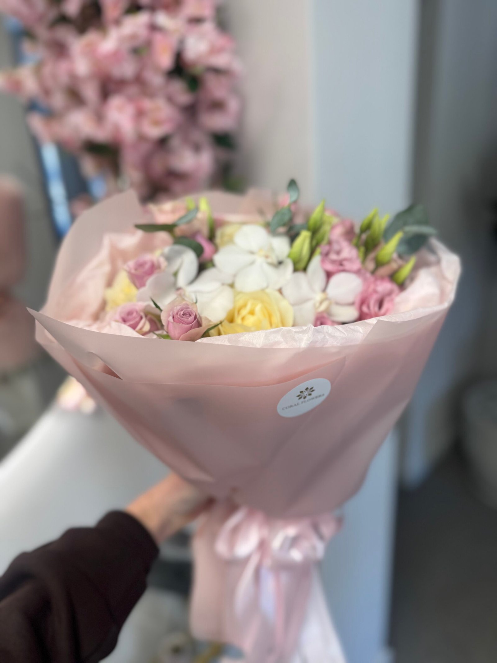 Švelni pastelinių spalvų puokštė, kurioje dera baltos  ir rožinės rožės bei baltos orchidėjos. Elegantiškas ir romantiškas pasirinkimas Valentino dienai – kai norisi meilę išreikšti subtiliai ir su skoniu.