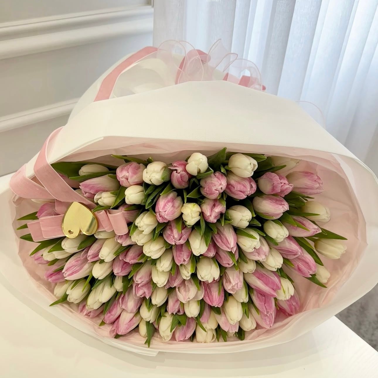 Kruopščiai sudėliotos tulpės sudaro tankią, prabangią kompoziciją, kuri džiugina savo gausa ir švelnumu. Puokštė įpakuota į pastelinių atspalvių dekoratyvinį popierių, perrišta stilinga juostele su aukso spalvos širdele – subtili, bet išskirtinė detalė.