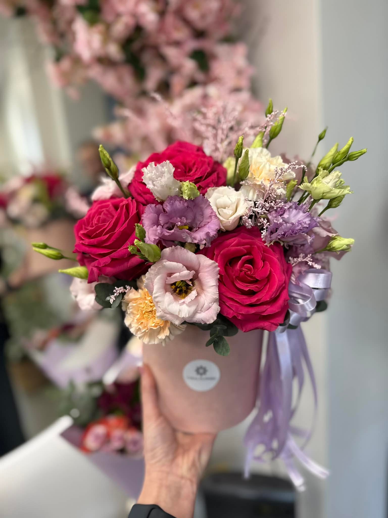 Prabangi gėlių dėžutė su ryškiomis rožėmis, eustomos ir eukaliptas. Švelni spalvų harmonija sukuria romantišką ir elegantišką nuotaiką, kuri papuoš bet kurią progą.