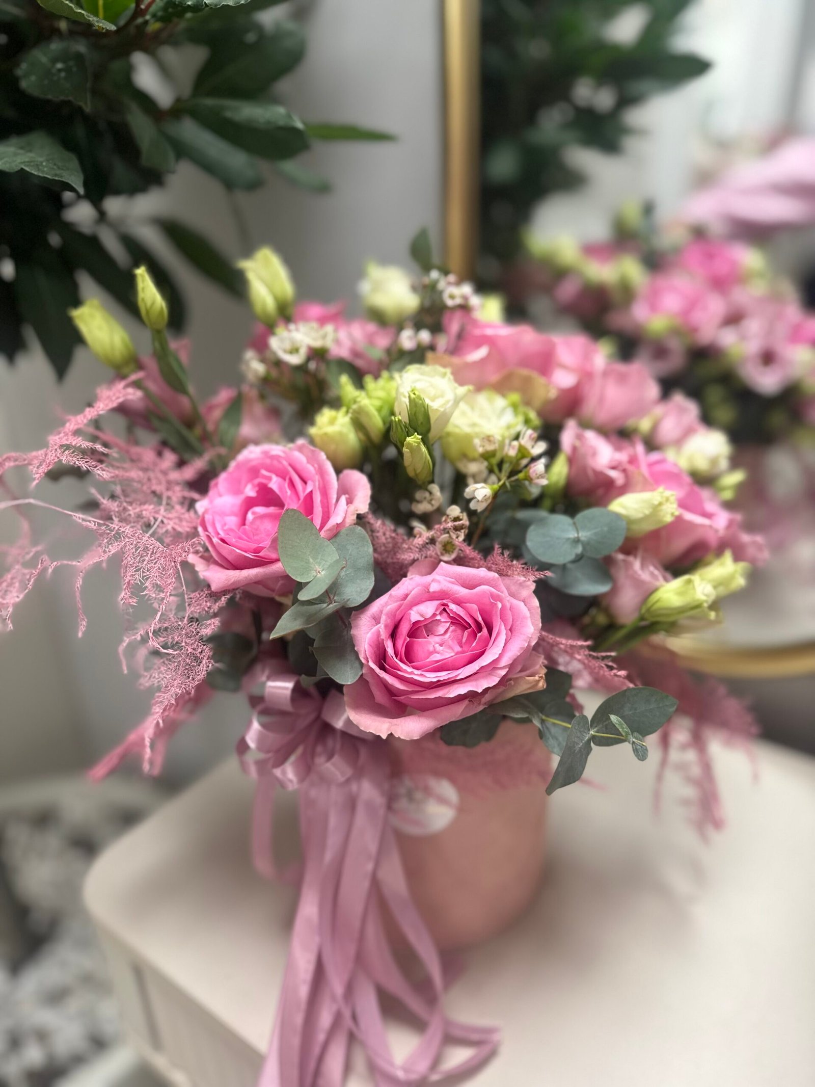 Švelnių pastelinių atspalvių gėlių dėžutė, kurioje dominuoja romantiškos rožinės rožės, lengvos eustomos ir subtilūs žalumynai, kuria jaukumo ir elegancijos pojūtį. Kompozicija papildyta pūkuotomis dekoratyvinėmis šakelėmis ir švelnia rožine kaspino juostele, suteikiančia ypatingo žavesio.