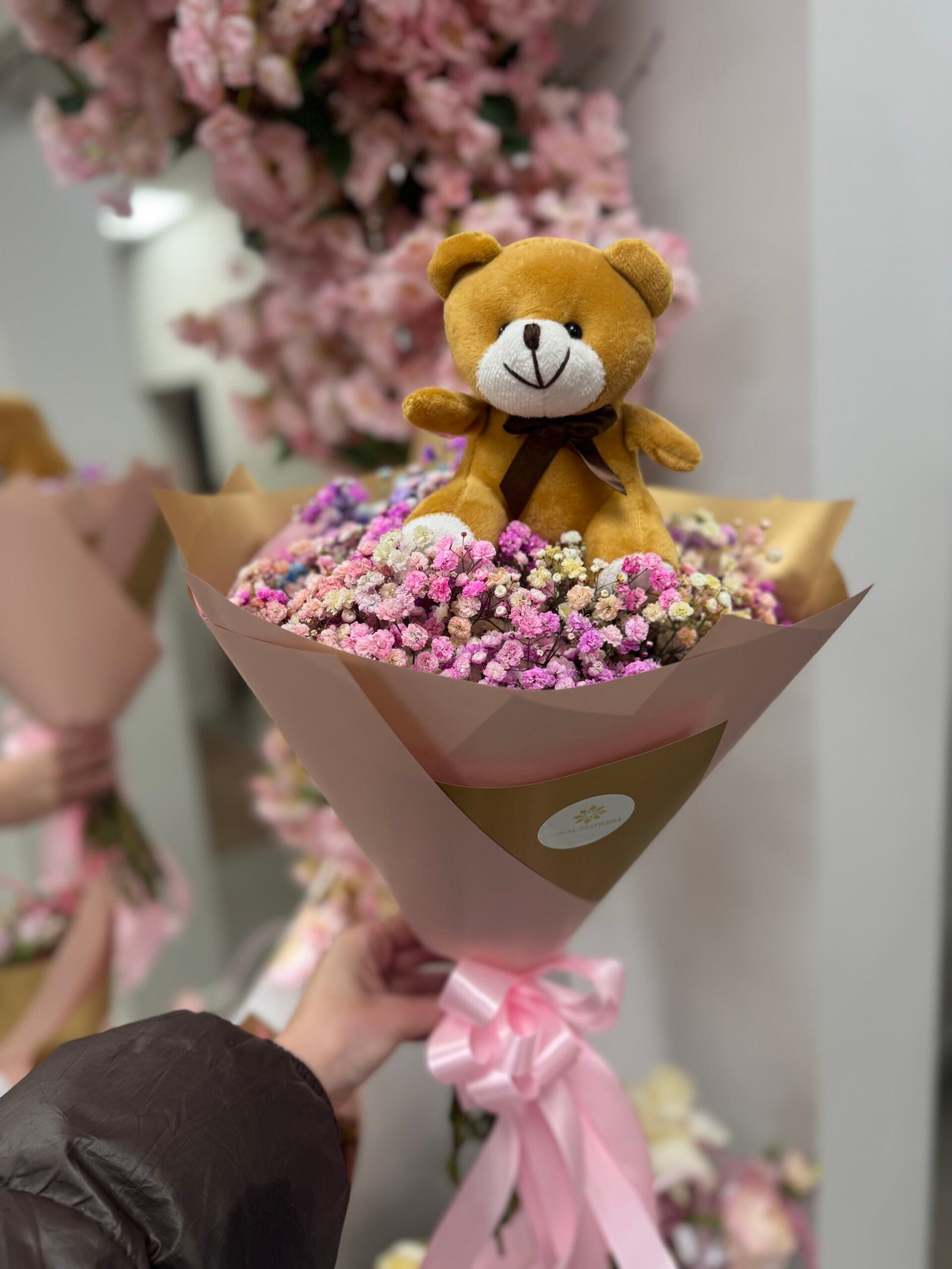 Maža ir švelni gipsofilijų puokštė su pliušiniu meškiuku. Puokštė sudaryta iš smulkių rožinių gipsofilijų žiedelių, centre dekoruota mielu rudu meškiuku.