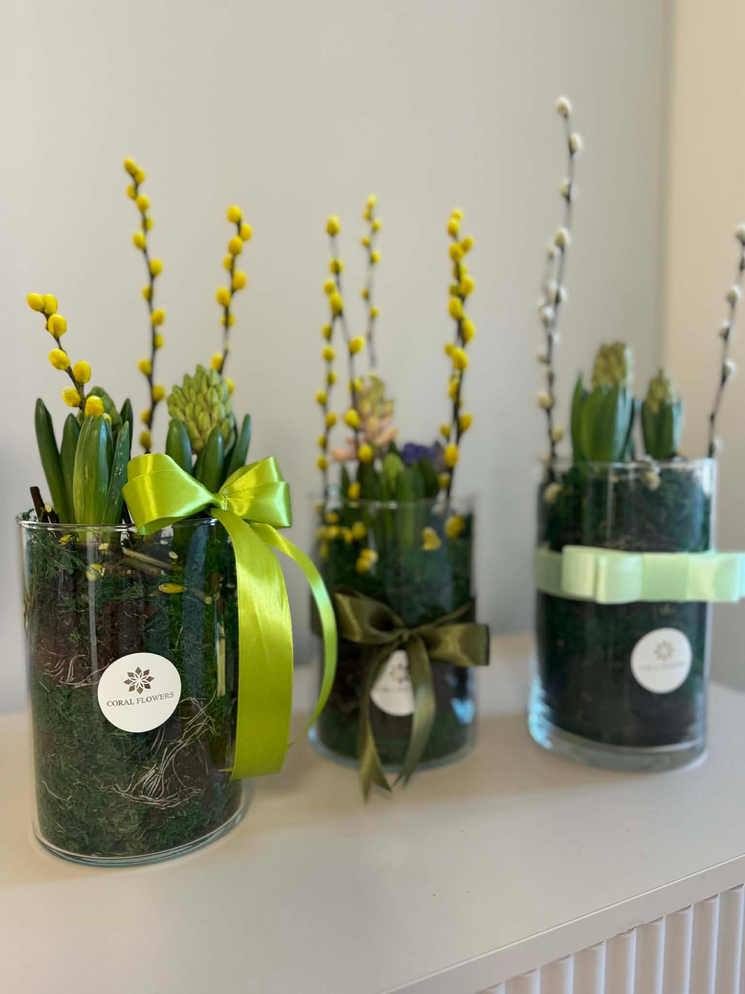 Pavasarinės gėlių kompozicijos su Hiacintais stiklinėse vazose – elegantiškas ir natūralus dekoro sprendimas namams ar dovanai. Su hiacintais, samanomis ir dekoratyvinėmis šakelėmis suteikia gaivumo, subtilaus aromato bei pavasariškos nuotaikos bet kuriai erdvei. Minimalistinis dizainas puikiai dera tiek moderniame, tiek klasikiniame interjere.
