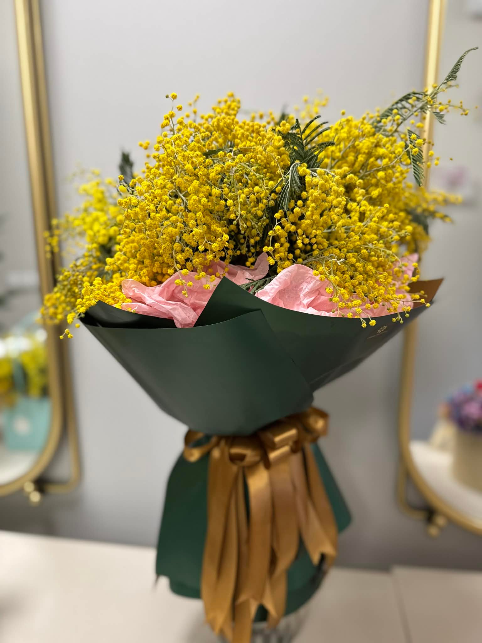 Puokštė kruopščiai surišta ir įpakuota į švelnių pastelinių atspalvių dekoratyvinį popierių, kuris subtiliai pabrėžia sodrią mimozų spalvą. Lengva, elegantiška ir išskirtinai nuotaikinga kompozicija.
