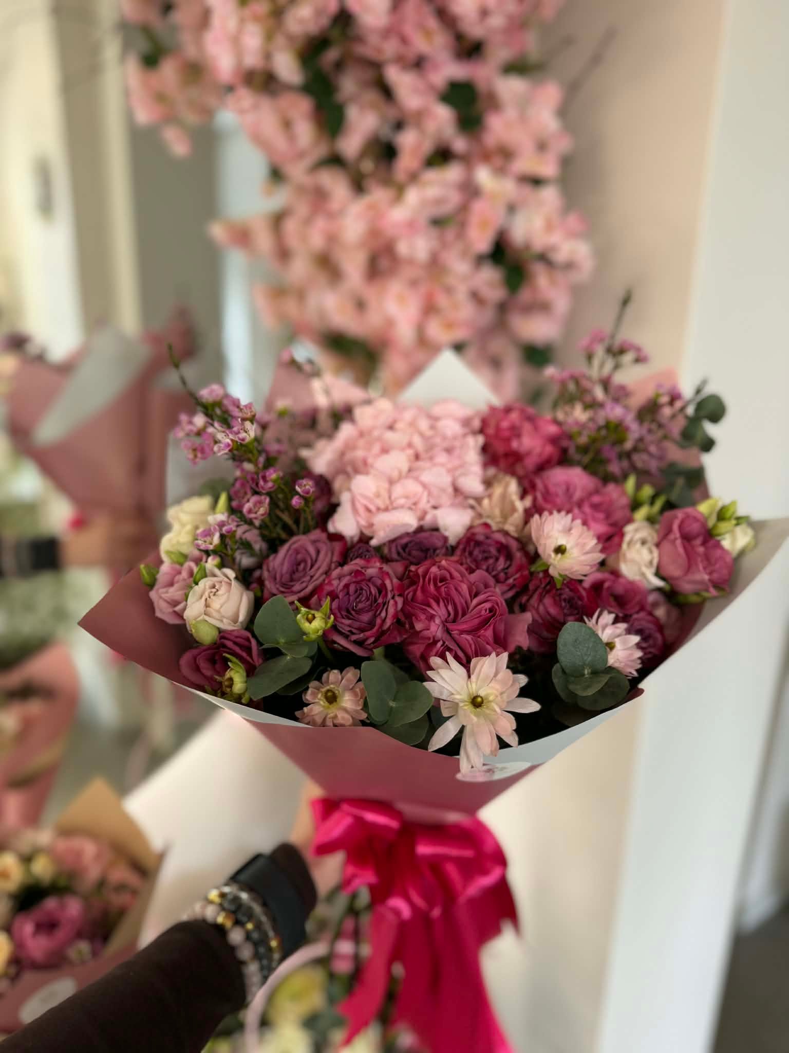 Tai išskirtinė, elegantiška puokštė, sukurta perteikti šilčiausius jausmus. Kompozicijoje dera  rožės, švelni hortenzija, subtilios eustomos bei smulkūs žiedai, kuriuos papildo gaivus eukalipto lapai. Ši puokštė išsiskiria harmoningais rausvų, rožinių atspalvių deriniais, suteikiančiais prabangos ir romantikos įspūdį. Kiekviena detalė kruopščiai suderinta, kad sukurtų estetišką ir ilgai džiuginančią kompoziciją.