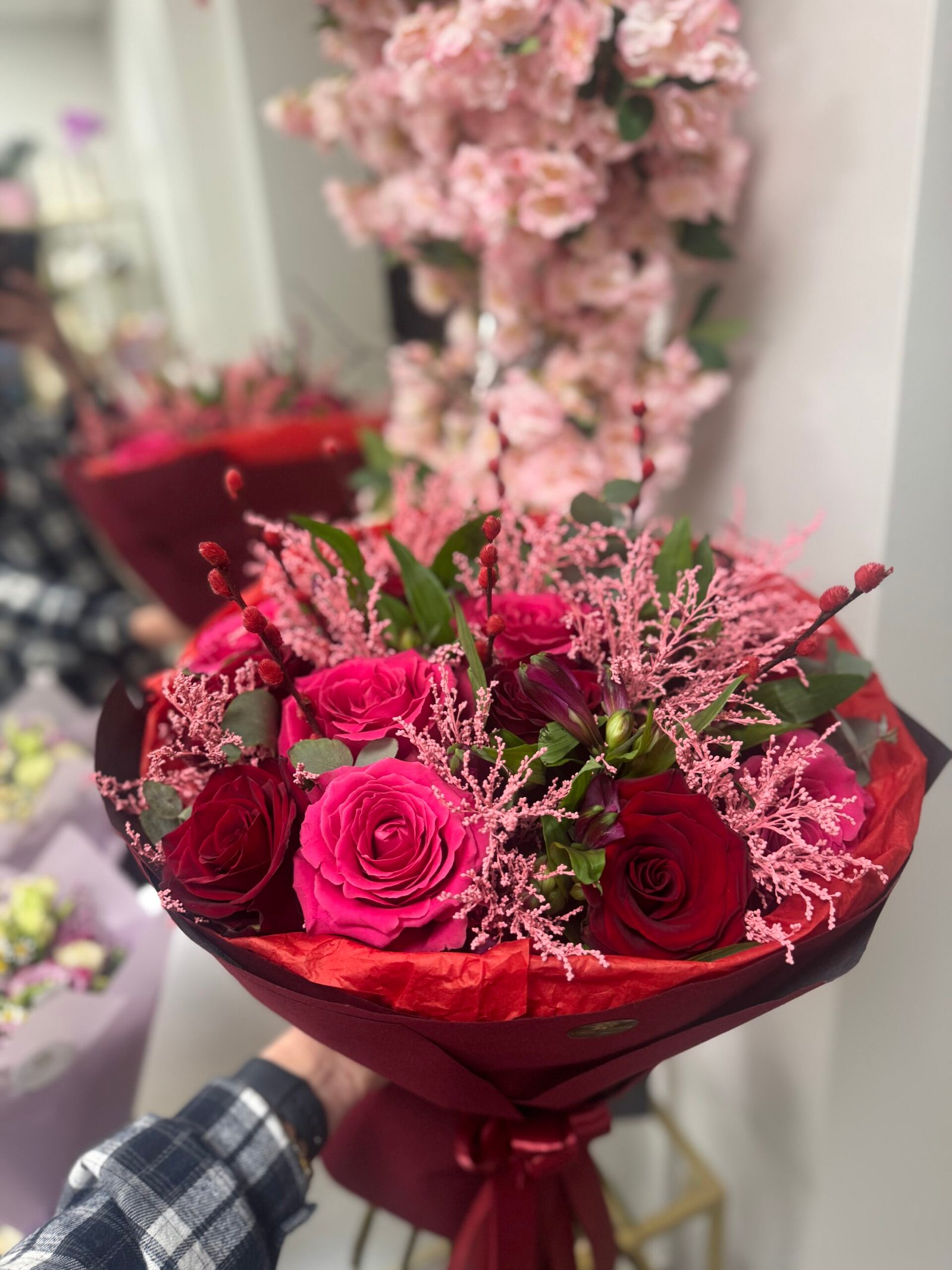 Elegantiška ir romantiška puokštė, kurioje dera prabangios raudonos Ekvadoro rožės, išraiškingos „Pink Floyd“ rožės bei švelnios alstromerijos. Sodri raudona spalva susilieja su ryškiais rožiniais atspalviais, sukurdama išskirtinę ir jausmingą kompoziciją.