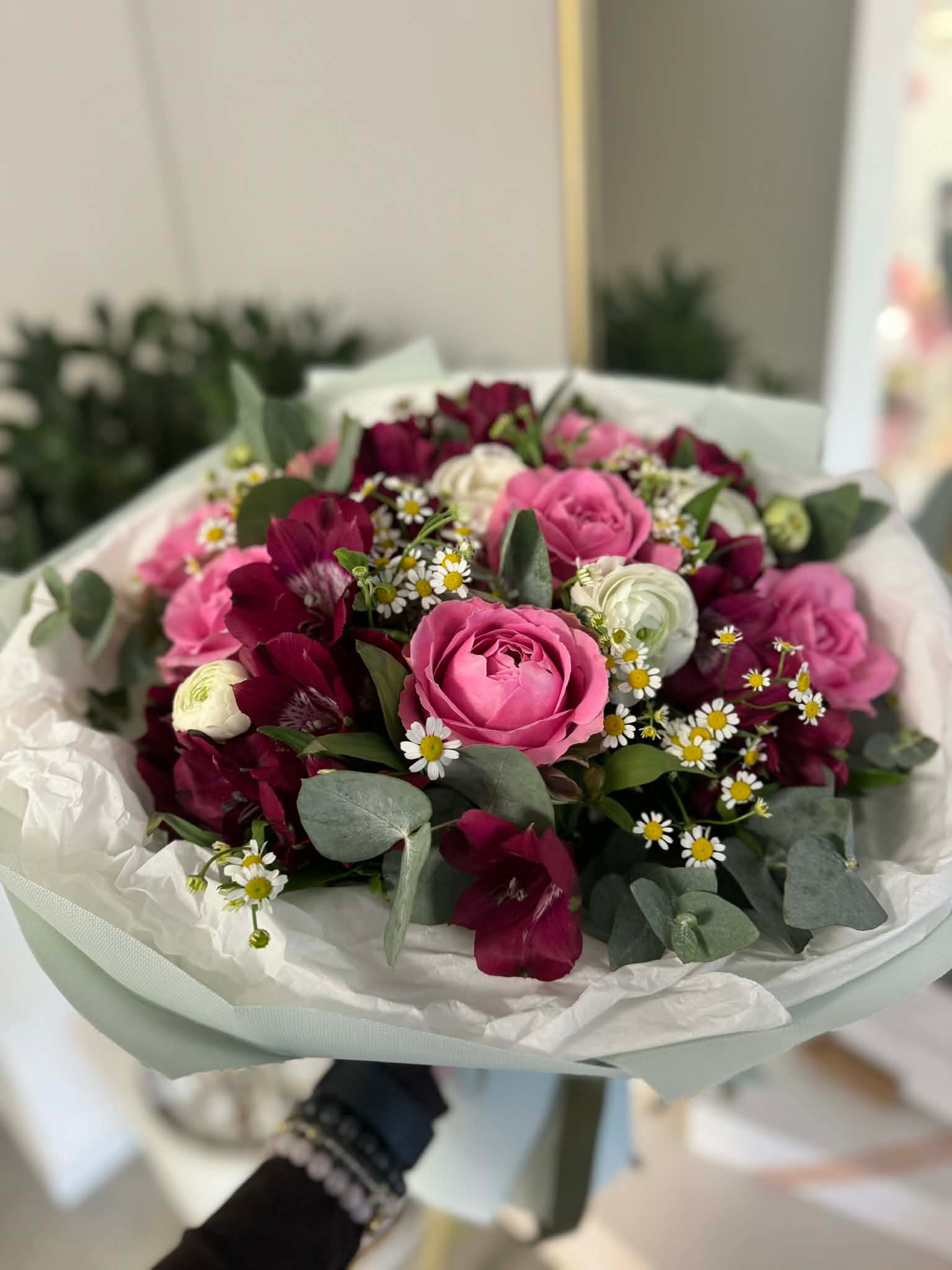 Elegantiška ir švelni gėlių puokštė – tai nuoširdus būdas išreikšti jausmus be žodžių. Kompozicijoje dera rožinės rožės, balti vedrynai, sodrios bordo spalvos alstromerijos bei lengvi ramunėlių akcentai, kuriuos papildo eukalipto lapai. Harmoningas spalvų derinys sukuria romantišką ir šiltą nuotaiką, todėl ši puokštė puikiai tinka gimtadieniui, sukakčiai, padėkai ar tiesiog maloniam netikėtumui artimam žmogui.