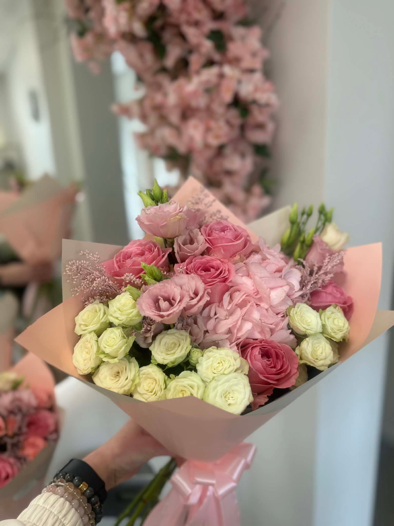 Romantiška ir elegantiška Mamos dienos puokštė su rožinėmis ir kreminėmis rožėmis, hortenzija bei subtiliais eustomų žiedais. Švelni spalvų paletė kuria jaukumo, meilės ir šilumos jausmą – tobula dovana mamai ypatingai progai. Kiekviena puokštė kruopščiai komponuojama iš šviežių gėlių, išlaikant prabangų ir estetišką dizainą. Užsisakykite Mamos dienos gėles ir pradžiuginkite mamą išskirtine staigmena.