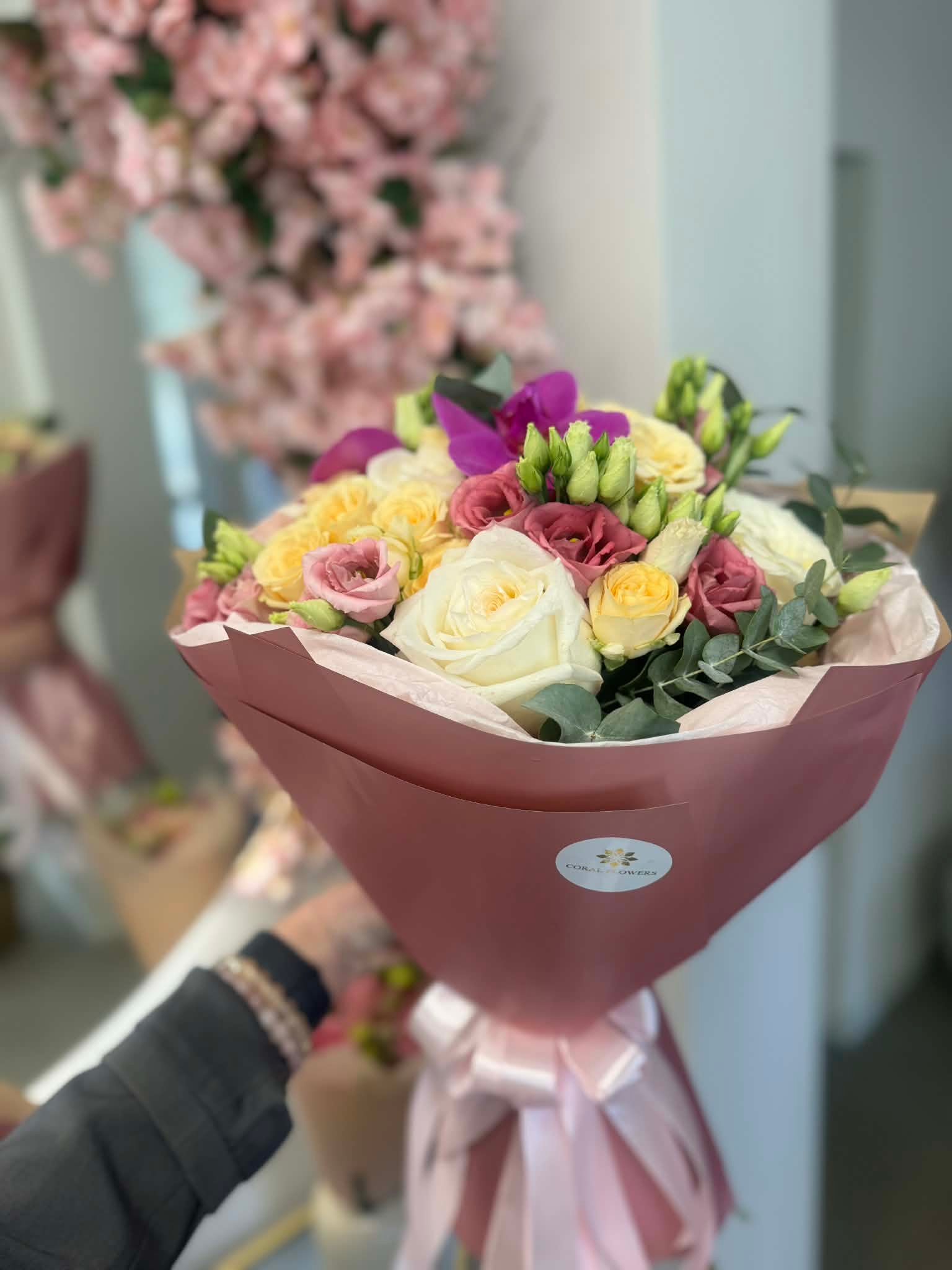 Baltų rožių puokštė su orchidėja – tai elegantiška ir romantiška gėlių kompozicija, kuri puikiai tinka ypatingoms progoms. Puokštėje derinamos baltos, rožinės ir švelniai geltonos rožės, papildytos išskirtine orchidėja bei gaiviais eukalipto lapais. Ši prabangi gėlių puokštė spinduliuoja švelnumu ir harmonija, todėl yra idealus pasirinkimas gimtadieniui, jubiliejui ar mylimam žmogui pradžiuginti. Modernus įpakavimas suteikia kompozicijai išskirtinį stilių.