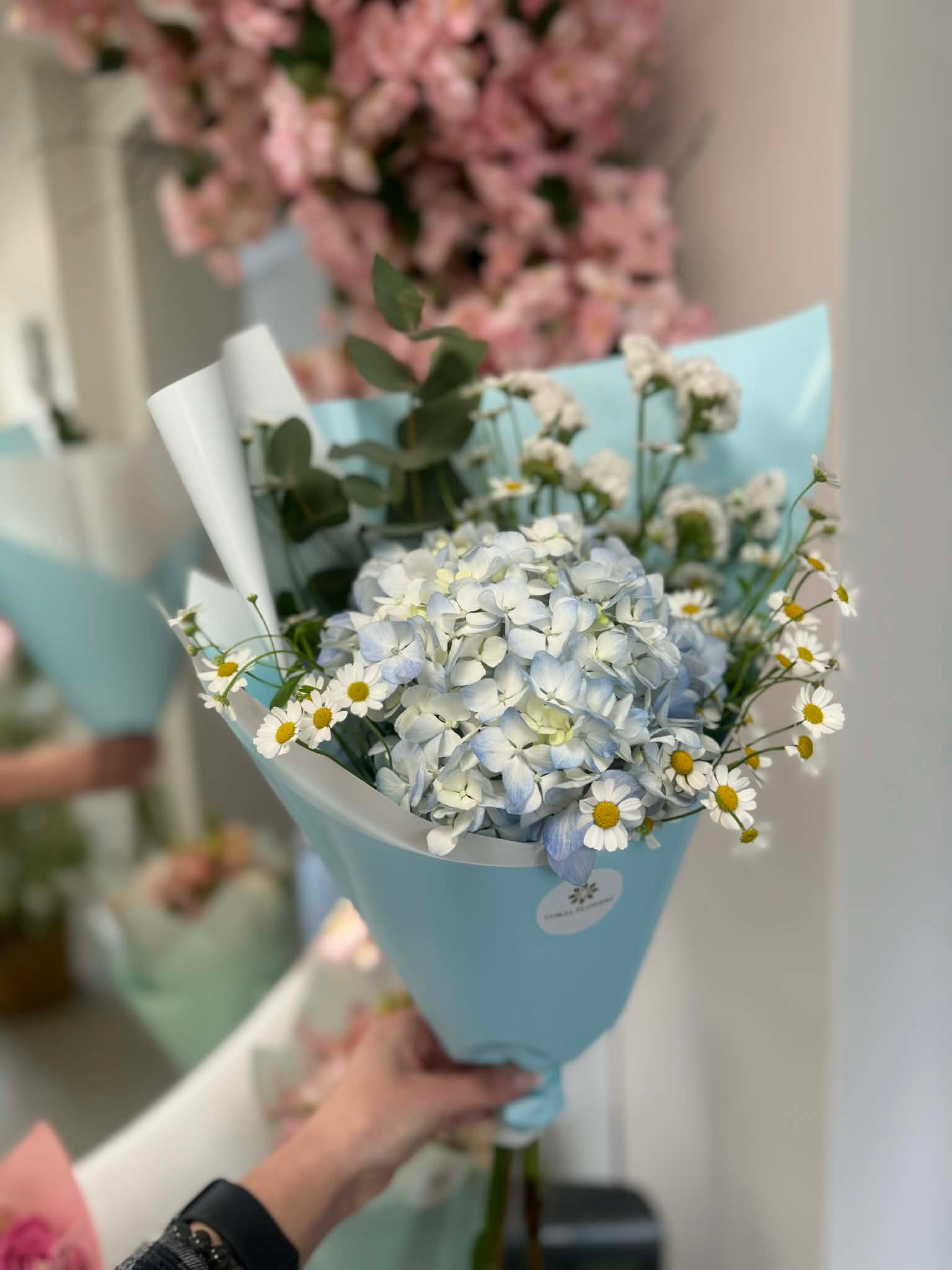 Gaivi ir elegantiška gėlių puokštė su švelnia mėlyna hortenzija, papildyta smulkiomis baltomis ramunėmis ir eukalipto žaluma. Minimalistinis, tačiau išskirtinis dizainas sukuria lengvumo ir natūralumo įspūdį. Puokštė supakuota į stilingą mėlynos ir baltos spalvos popierių, todėl puikiai tinka gimtadieniui, padėkai ar kaip subtili dovana ypatingai progai
