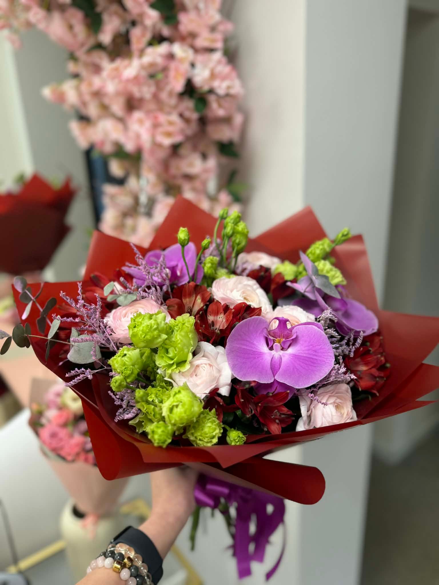 Elegantiška ir išskirtinė gėlių puokštė su ryškia  orchidėja,vedrynais,eustomomis ir eukaliptu. Ši puokštė puikiai tinka ,MOTINOS DIENAI ,gimtadieniui, Valentino dienai ar ypatingai progai. Kiekviena puokštė kruopščiai surišta rankomis, naudojant aukštos kokybės gėles, užtikrinant ilgalaikį grožį ir gaivumą. Tai puikus pasirinkimas norint nustebinti artimą žmogų ar papuošti namus stilingu akcentu. Užsisakykite šią prabangią gėlių puokštę internetu ir pradžiuginkite brangius žmones jau šiandien!