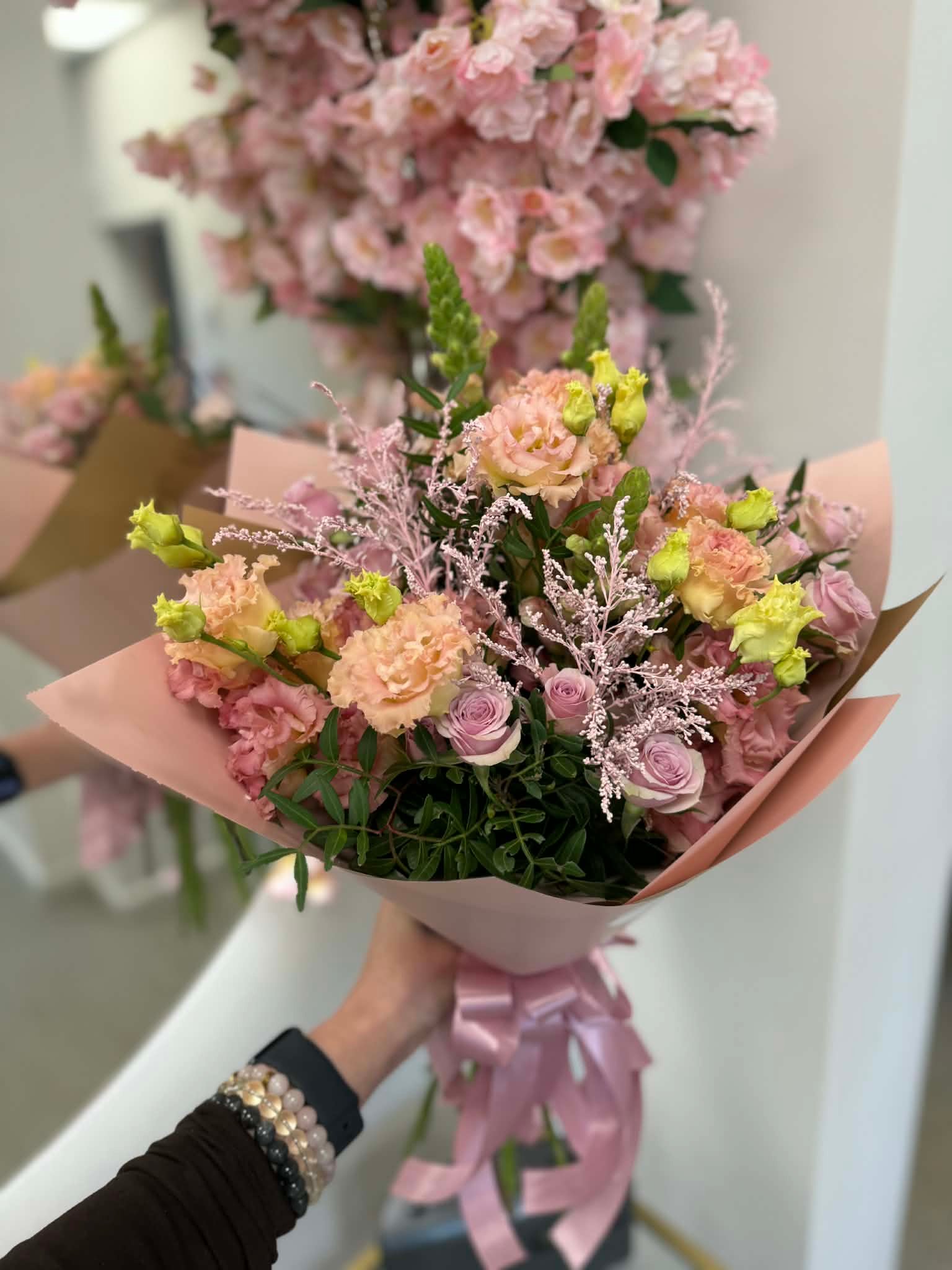Švelni ir elegantiška puokštė, kurioje harmoningai susipina rožinės rožytės, eustomos ir lengvi kiti augalai. Pasteliniai persikiniai ir rožiniai atspalviai suteikia kompozicijai šilumos, romantikos ir subtilaus žavesio. Puri ir lengva puokštės forma kuria prabangų, tačiau natūralų įvaizdį.