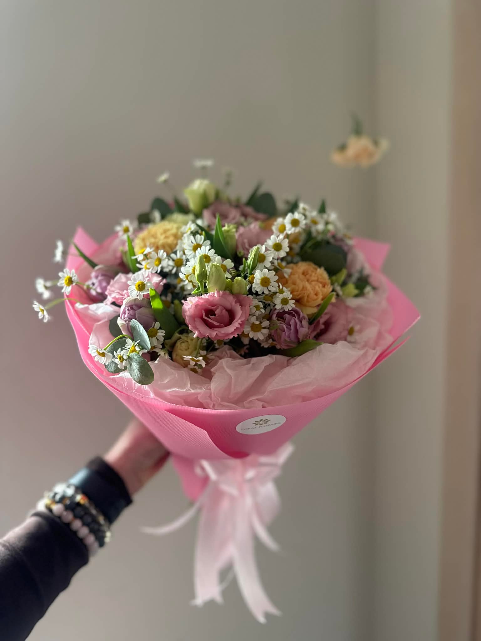 Tai išskirtinė, elegantiška puokštė, sukurta perteikti šilčiausius jausmus. Kompozicijoje dera tulpės, subtilios eustomos bei gvazdikai, kuriuos papildo gaivūs eukalipto lapai. Ši puokštė išsiskiria harmoningais rausvų, rožinių i atspalvių deriniais, suteikiančiais prabangos ir romantikos įspūdį. Kiekviena detalė kruopščiai suderinta, kad sukurtų estetišką ir ilgai džiuginančią kompoziciją.