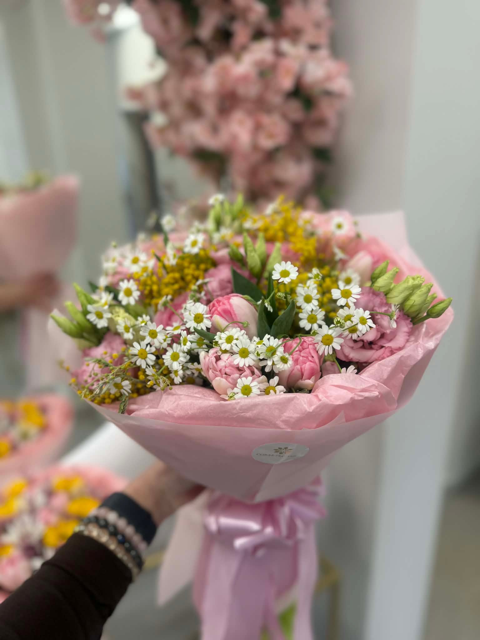 Švelniai rožinės tulpės derinamos su lengvomis ramunėlėmis ir subtiliais geltonais akcentais sukuria gaivų, natūralų ir labai jaukų vaizdą.