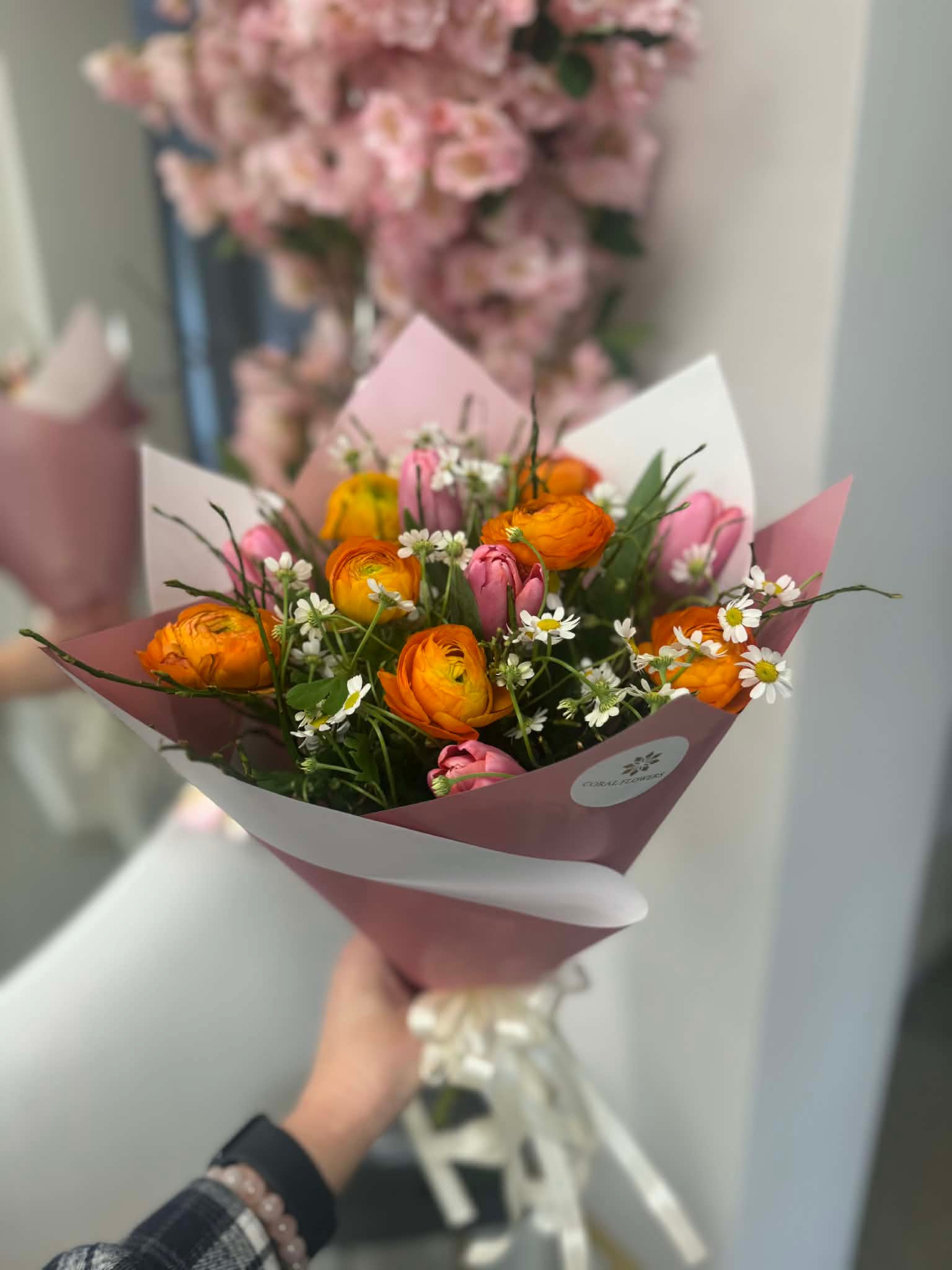 Švelni, pavasariu alsuojanti puokštė, sukurta tiems ypatingiems momentams, kai jausmai kalba tyliau nei žodžiai. Ryškūs oranžiniai ranunkulai subtiliai dera su rožinėmis tulpėmis, o smulkūs baltų žiedelių akcentai suteikia lengvumo ir natūralaus žavesio. Gaivūs žalumos potėpiai ir elegantiškas rožinis įpakavimas sukuria romantišką, šiltą nuotaiką.