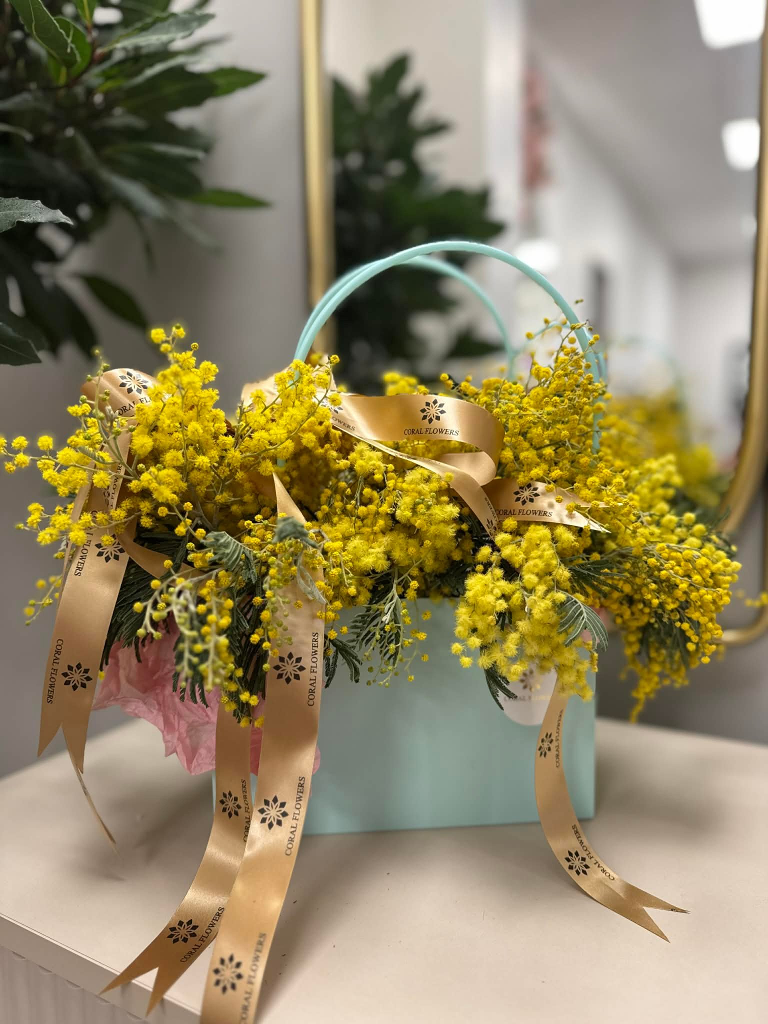 Ryški ir nuotaikinga gėlių kompozicija su kvapnia mimoza – tikras pavasario ir šilumos simbolis. Sodrūs geltoni žiedai sukuria lengvumo, šviesos ir pozityvios energijos įspūdį, o elegantiška dėžutė su subtiliomis juostomis suteikia dovanai išskirtinumo.