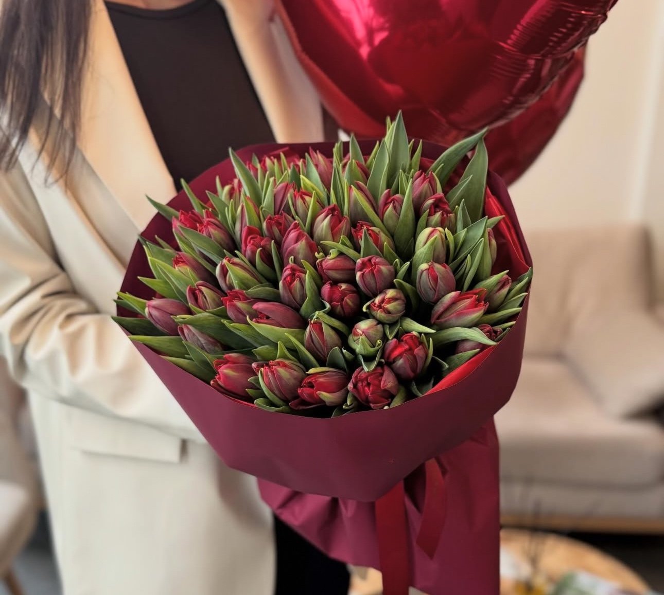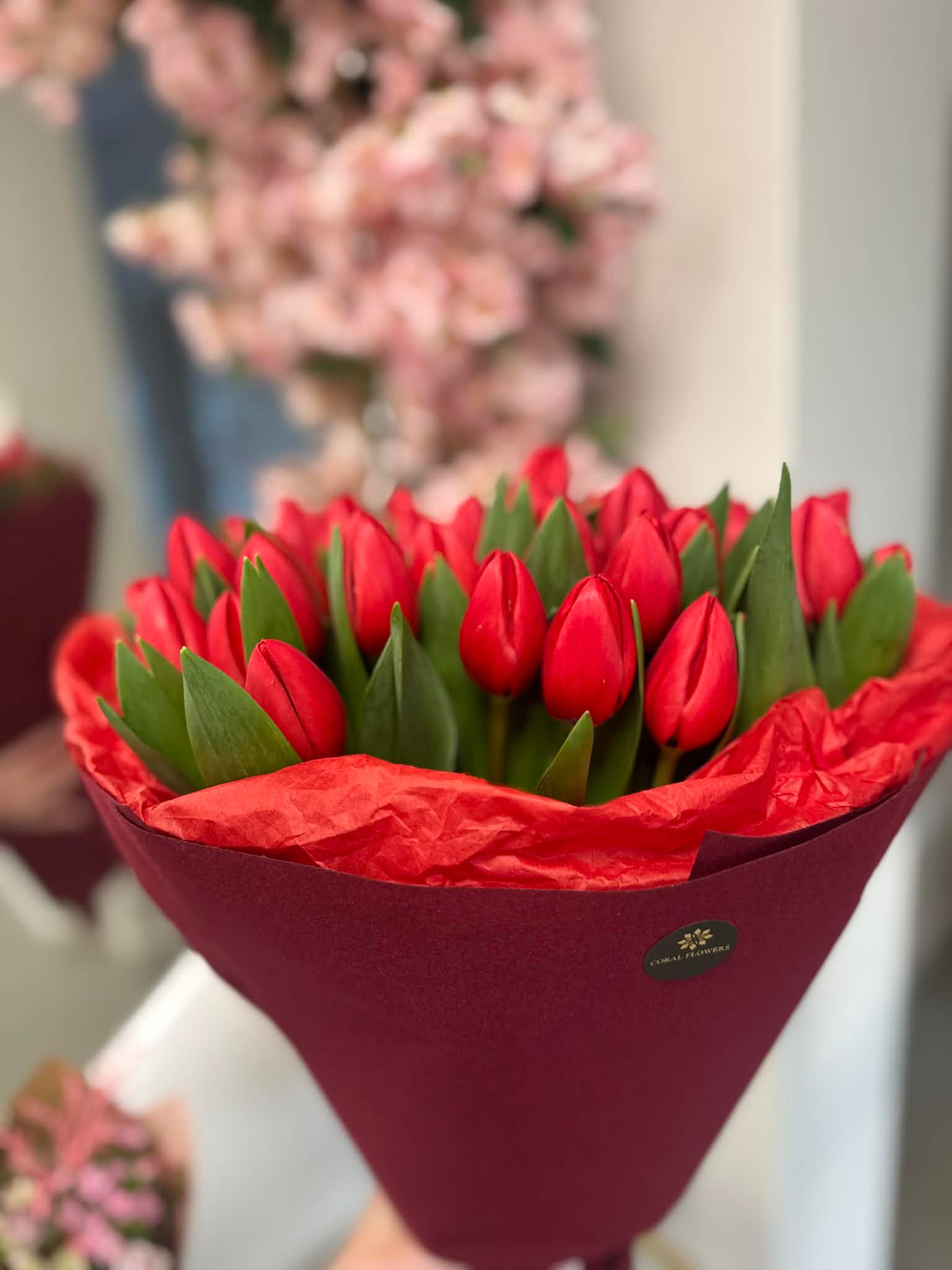 Prabangi, išraiškinga ir kupina jausmų – tanki raudonų tulpių puokštė sukurta ypatingoms progoms. Gilūs, sodrūs žiedų atspalviai simbolizuoja meilę, aistrą ir stiprų ryšį, o gaivi žaluma suteikia kompozicijai gyvybingumo bei elegancijos.