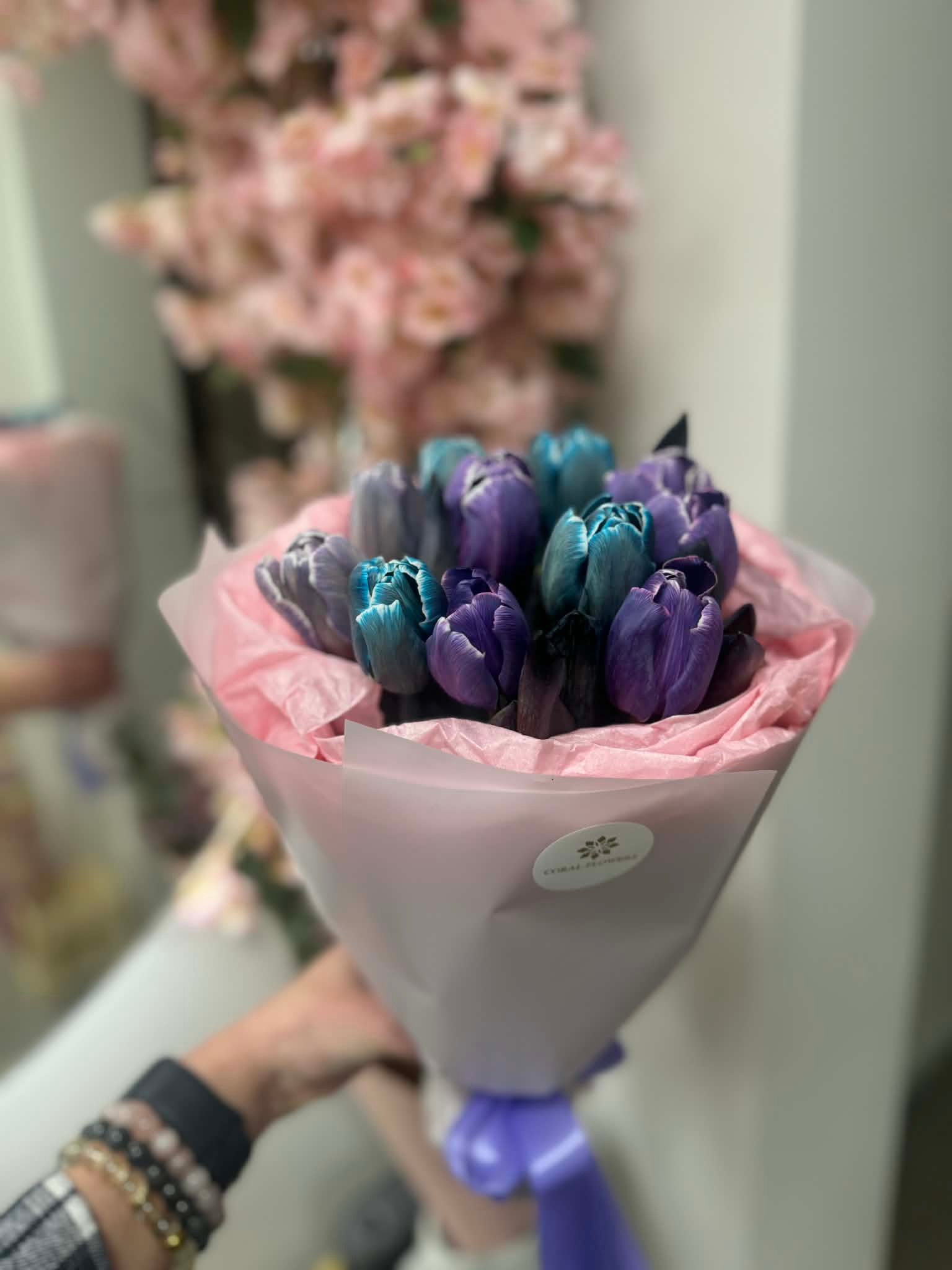 Elegantiška tulpių kompozicija, sujungusi sodrius mėlynos ir violetinės atspalvius, sukuria išskirtinį ir modernų įvaizdį. Tankiai sudėtos, dar tik prasiskleidusios žiedų galvutės simbolizuoja pavasario gaivą, naują pradžią ir subtilų grožį. Švelni levandų spalvos pakuotė harmoningai papildo žiedus ir suteikia puokštei lengvumo bei romantikos.